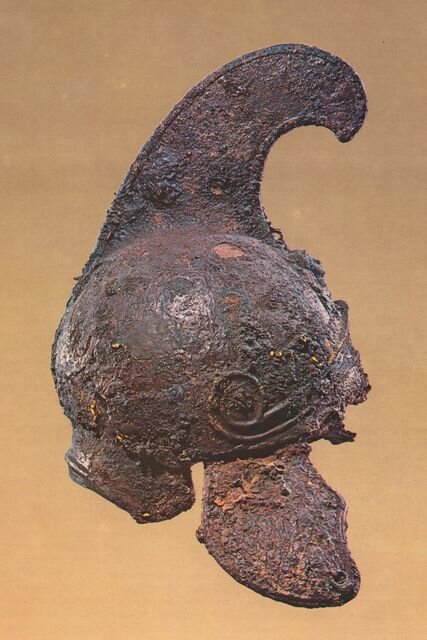Шлем был т.н. халкидского типа, который к V веку до н.э. вытеснил хорошо известный всем коринфский тип. Благодаря более совершенной конструкции этот шлем был легче и имел лучший обзор. Кстати, нащечники шлема этого типа были позаимствованы легионерами.