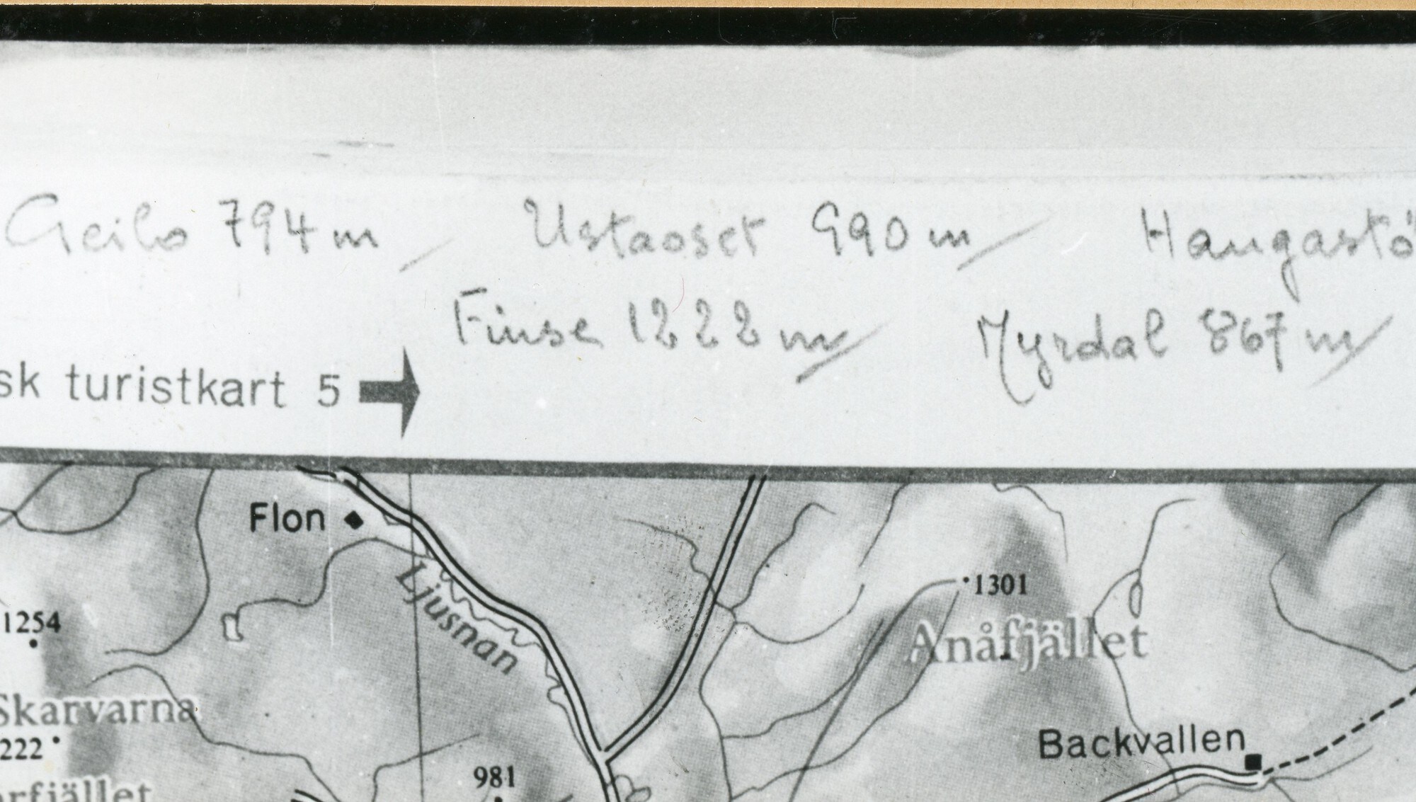 "Geilo 794 m, Ustaoset 990 m, Haugastol" [точнее Haugastøl; фотография обрезала край страницы: далее должно быть число и "m") - первая строка,